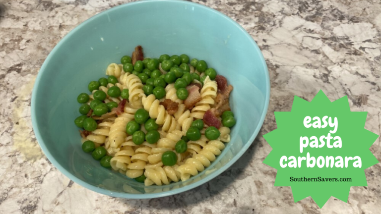 Who doesn’t love bacon and cheese? This pasta carbonara comes together quickly, and for a side you’re just going to be picking your favorite Aldi salad mix.