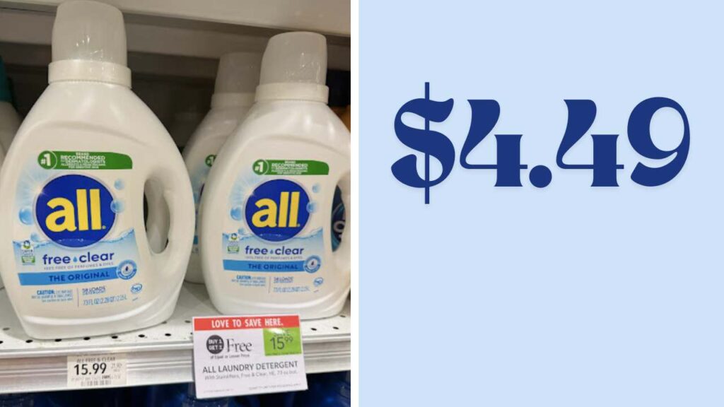 Publix – all Detergent, 73 oz, or Mighty Pacs, 32-39 ct., B1G1 at $15.99 ($7.99)