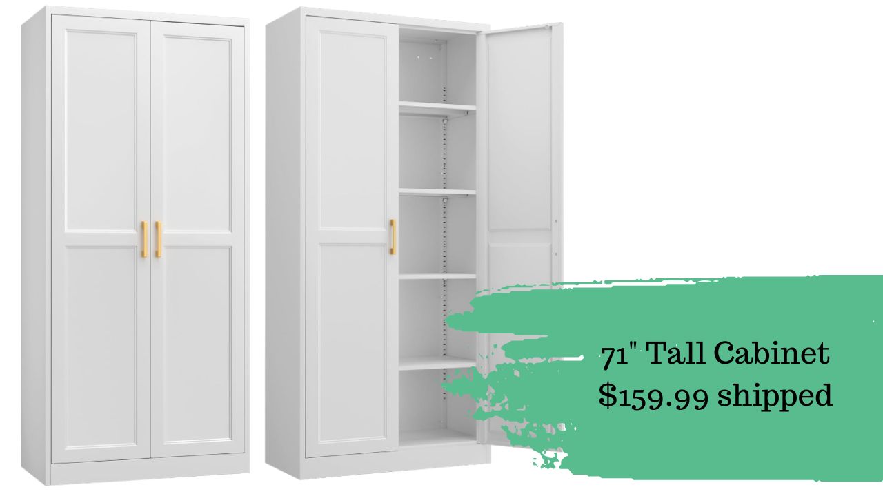 Right now, speed over to Amazon where you can score this 71″ tall cabinet with doors for just $143.99 when you clip the coupon!