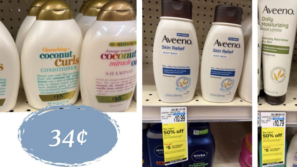 Head into CVS and save on head-to-toe products! This week and next you can score OGX haircare and Aveeno body wash and lotion for just 34¢ each using this easy deal idea.