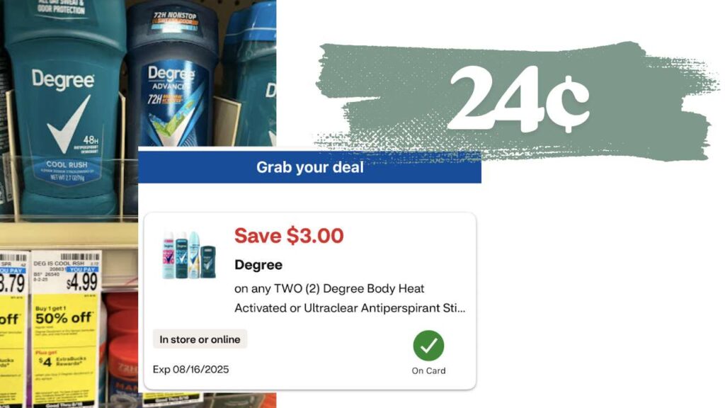 Load an eCoupon and use it with the B1G1 50% sale to score Degree Deodorant for only 24¢ after ExtraCare Bucks.