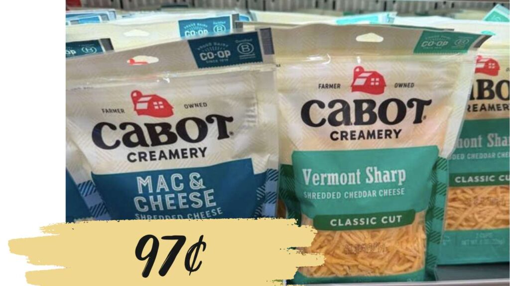 - Cabot Cheese Bar or Shredded Cheese, 6-8 oz, starting, B1G1 at $3.72 ($1.86)