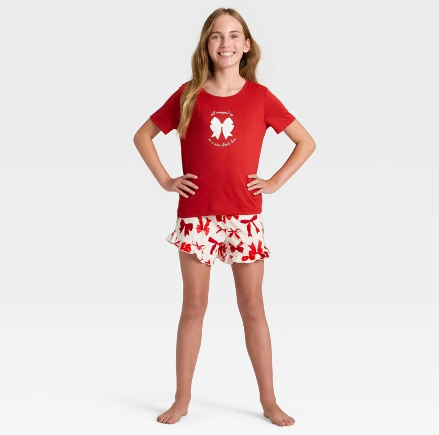 Girls’ 2pc Bows Short Sleeve Holiday Pajama Set – Cat & Jack, Red – $10