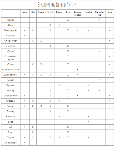 Wondering if you have what you need to make these right now? I put together a handry chart based on these seasoning blends so that you can quickly check your pantry and see if you have what you need.