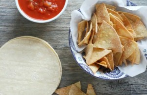 These tortilla chips are baked in the oven and can be dipped in salsa or guacamole.
