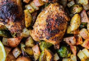 One Pan Chicken with Potatoes and Brussels Sprouts | A Saucy Kitchen