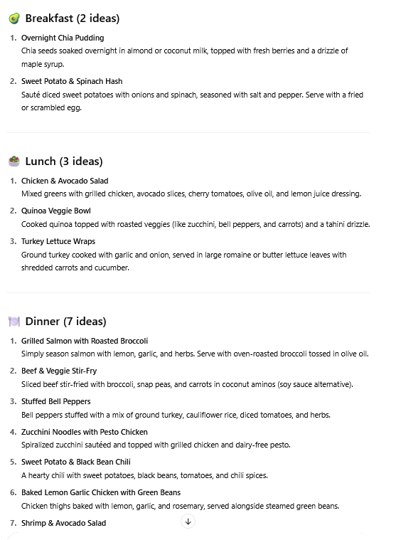 Maybe you or someone in your family has some kind of food allergy or dietary restriction. Sometimes the more common meal plans you find online (even here!) don’t take those into account. ChatGPT is great at taking restrictions like that into account. (However, please read any ChatGPT suggestions carefully if you are dealing with food allergies. You don’t want to take any chances!)