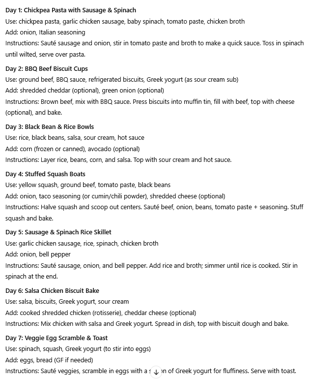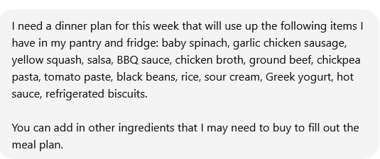 Have you ever opened your pantry or fridge and looked at all the food but haven’t been able to come up with something you can actually eat for dinner? ChatGPT is a pro at taking data and quickly organizing it into something helpful.