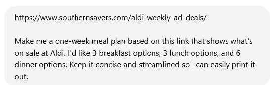 You can even give ChatGPT a list of items on sale, whether it’s a link to a website or a picture of an ad. I make some meal plans based on sale ads, but maybe you need one for a different store.
