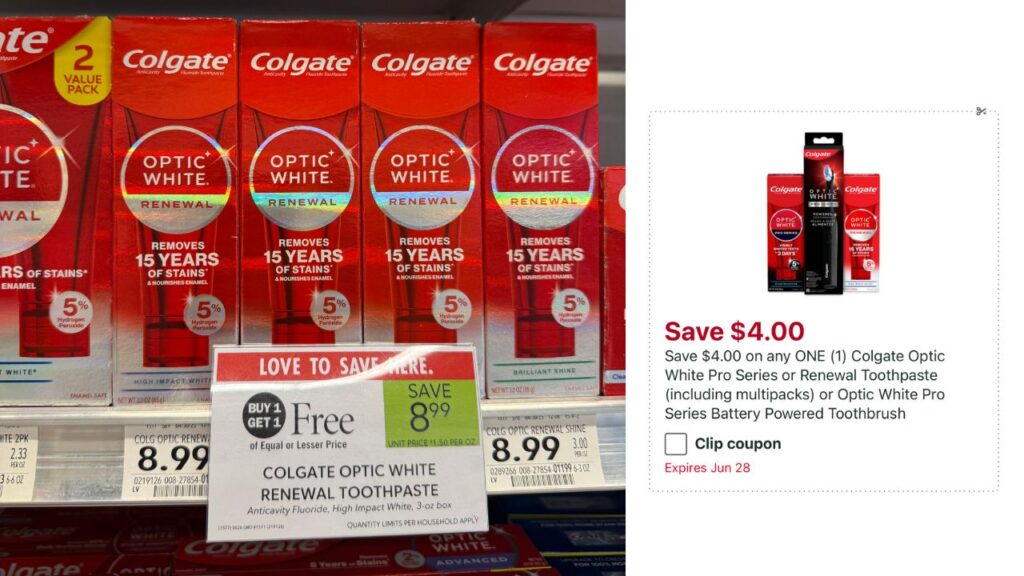 - Colgate Optic White Toothpaste or Renewal, 3 oz, B1G1 at $8.99 ($4.49)