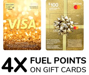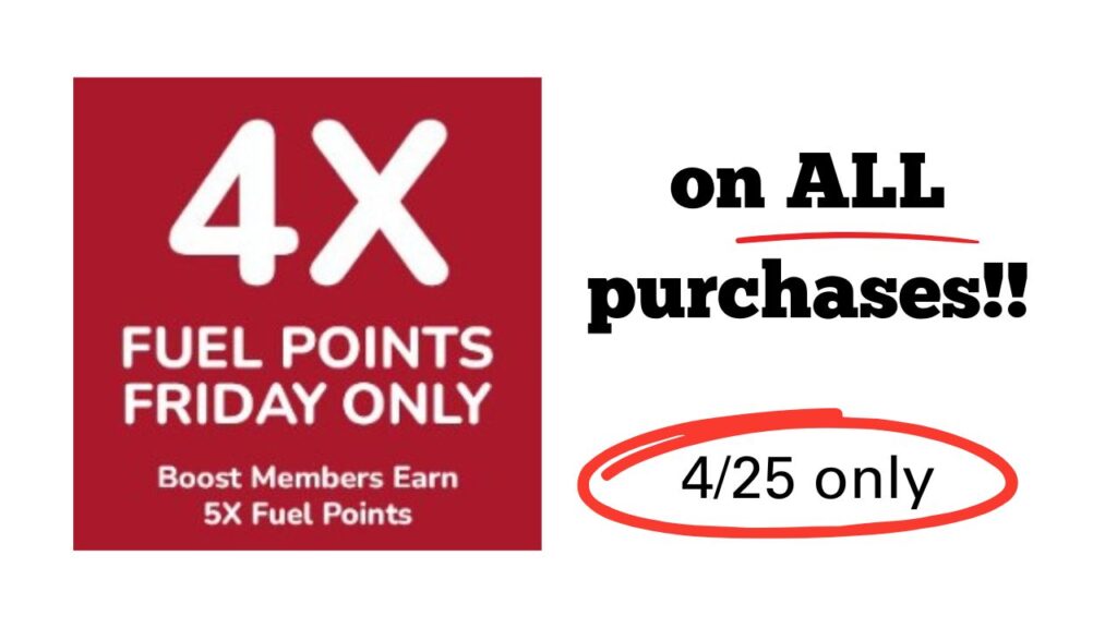 Each dollar you spend = 1 fuel point. When you earn 4x fuel points, every dollar = 4 points. So today that means every $25 you spend on eligible groceries and gift cards, you earn 100 fuel points, which is equal to 10¢ off a gallon of gas up to 35 gallons!!