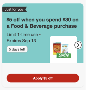 Head over and see what Target Circle offers you have in your account this week. Many folks are finding great discounts on groceries with a new Circle offer for $5 off any $30 grocery purchase.