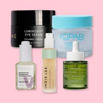 includes Kopari, Dime, Indie Lee, Korres, and Volition serums, cleansers, and moisturizers