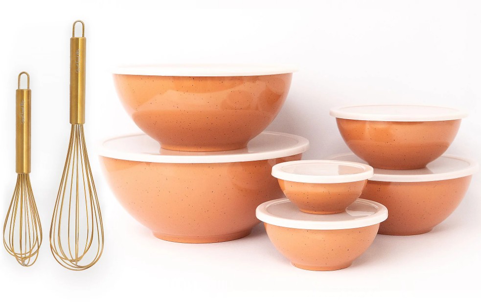 This melamine bowl set includes lids and two stainless steel whisks. It’s also dishwasher safe! Get it in one of two colors.