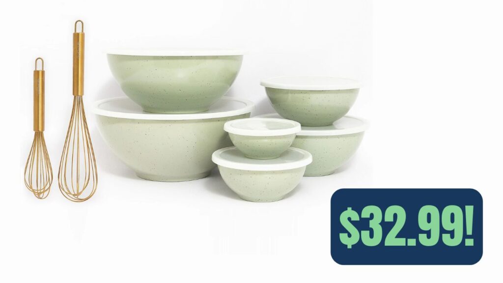 This melamine bowl set includes lids and two stainless steel whisks. It’s also dishwasher safe! Get it in one of two colors.