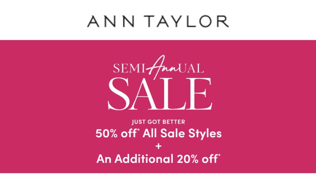 The Ann Taylor Semi-ANNual Sale ends tonight! Get an EXTRA 50% off Sale Styles + an additional 20% off. No code necessary.