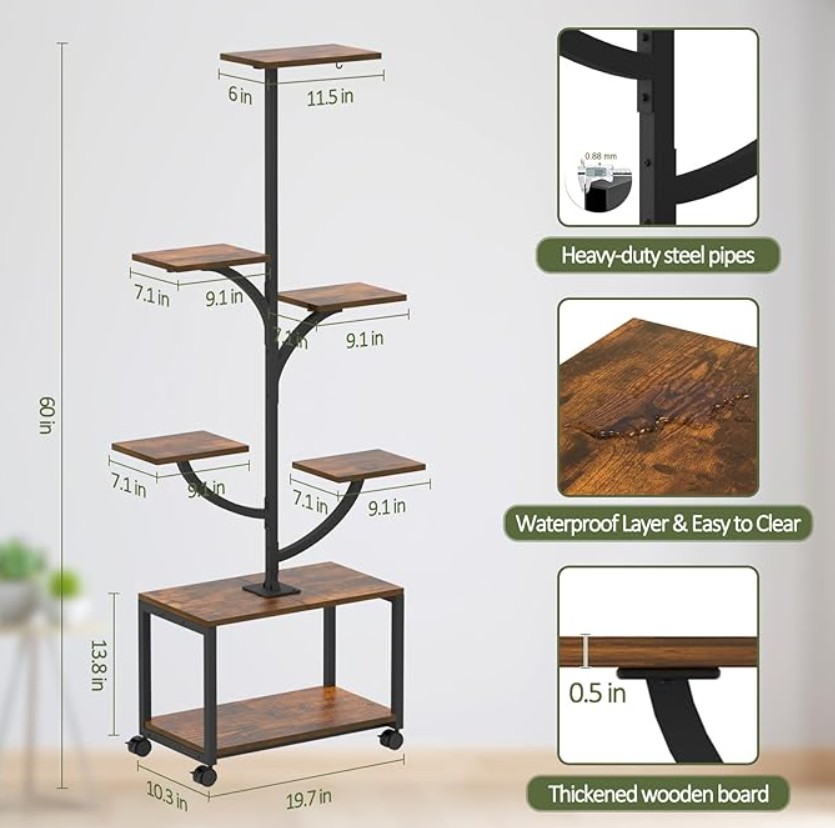 This metal indoor plant stand measures 60-inches tall and features 7 wooden pot stands with waterproof coating. The 3 full-spectrum grow lights have 8 adjustable brightness levels and 4/8/12-hour timer options.