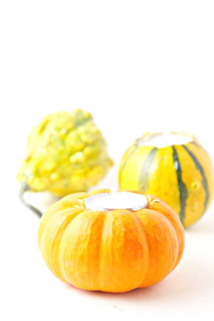 If you have time to break out the drill, get creative with gourds and small pumpkins to make these festive candles.