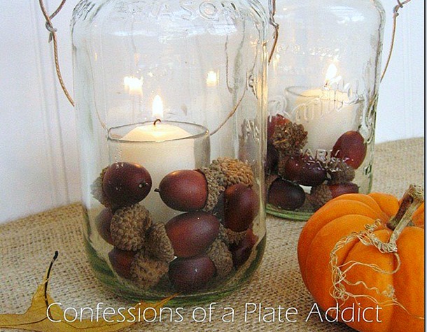 If you live somewhere that you see a lot acorns on the ground during the fall, grab a handful of acorns, a jar or vase and a pillar candle to make a rustic, yet elegant candle for your table or mantle.