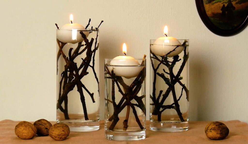 If rustic elegance is your fall style, add to your fall decorations floating tea light candles that have small twigs submerged under water.