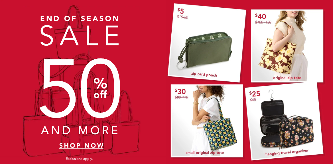 Right now, shop the Vera Bradley end-of-season sale!! Head over and find over 1,000 items up to 50% off including bags, leather and more.
