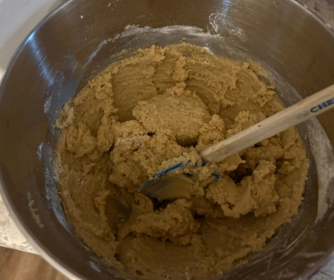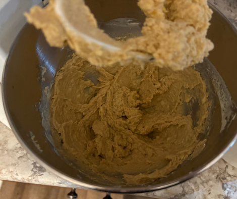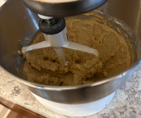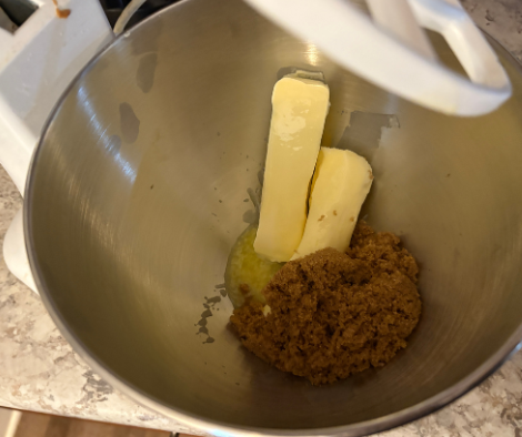 Begin by creaming butter and brown sugar in a stand mixer.