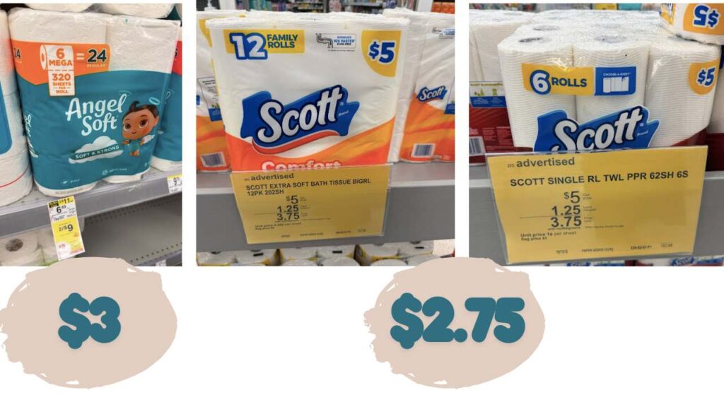 - Scott Comfort Plus, 12 family rolls, or Paper Towels, 6 Single Rolls, $5