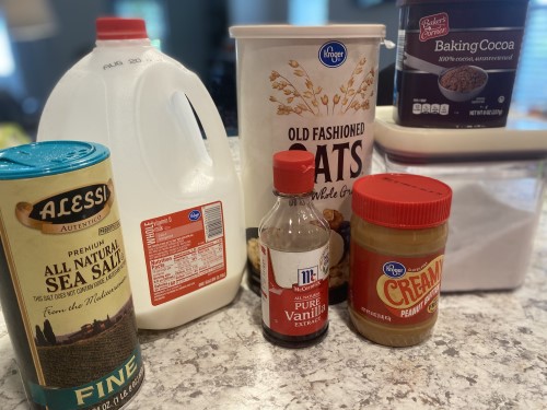 You’ll only need basic ingredients to make these: sugar, milk, butter, cocoa powder, oats, vanilla, salt, and cinnamon.
