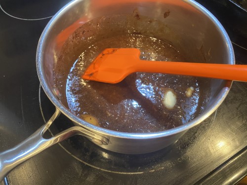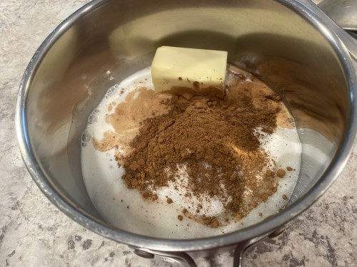 - Mix sugar, milk, butter, and cocoa powder in a saucepan over medium heat.