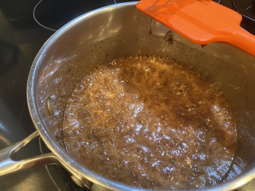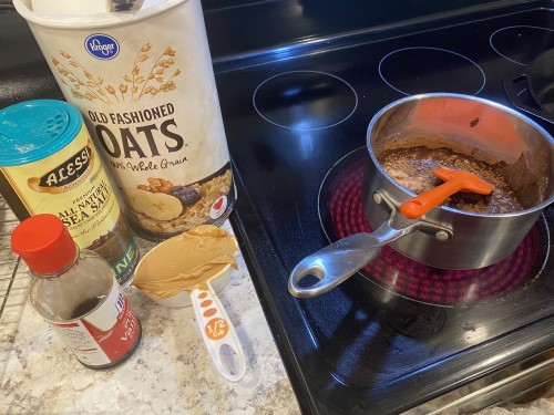- While you’re waiting for the mixture to boil, measure out the peanut butter and oats.