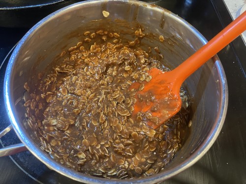 - Remove the pan from the heat and immediately stir in oats and peanut butter. Then add in the vanilla, salt, and cinnamon.