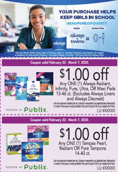 You can help #EndPeriodPoverty and save some money this week at Publix. Grab your favorite Always and Tampax items plus use a store coupon and manufacturer coupon to save $2 off each pack!!