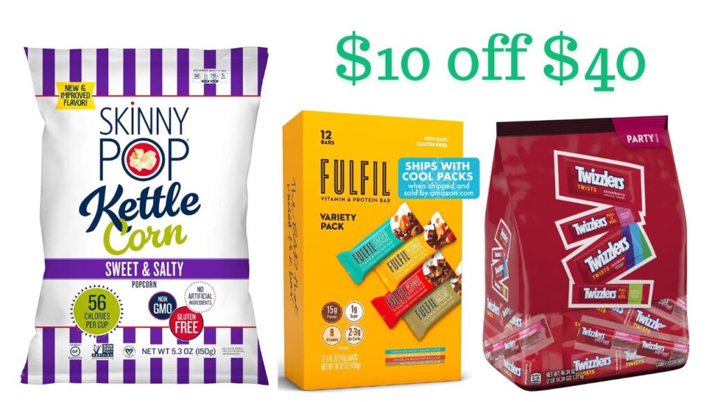 Right now, save $10 off $40 at Amazon on the purchase of select grocery items! Choose from candy, popcorn, protein bars and more.
