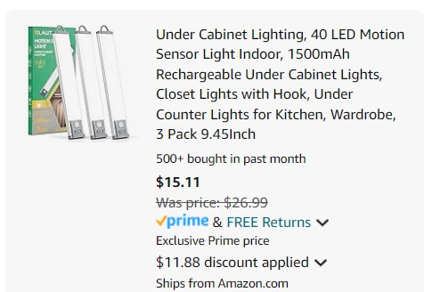 Prime members can get a great deal on this 3-Pack Under Counter LED Motion Sensor Light. Combine a coupon code with the sale price to get it for $15.11!