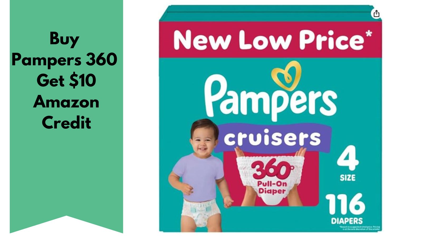 Right now, head to Amazon and get a box of Pampers 360 diapers and you’ll get a $10 Amazon credit!