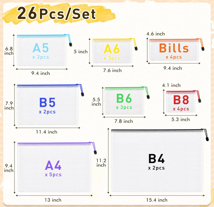 These multi-size mesh zipper storage pouches are perfect for class organization, office supplies, puzzles, board games storage, travel storage, cosmetics, bills, receipts and diapers bags.