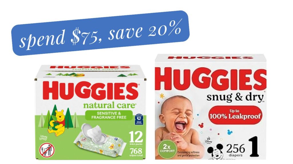 Right now at Amazon, you can save big on Huggies diapers and wipes! Spend $75 to get 20% off, plus use Subscribe & Save discounts as well!