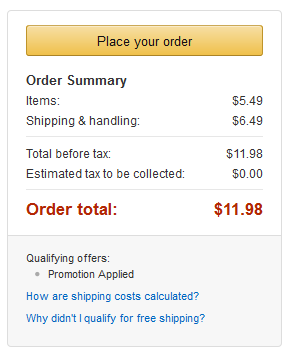 I added an item that was $5.49 to my cart and my shipping was $6.49. That’s for one item. So if you bought, (13) $5 items, Amazon Prime has paid for itself. That’s a little over (1) item per month.