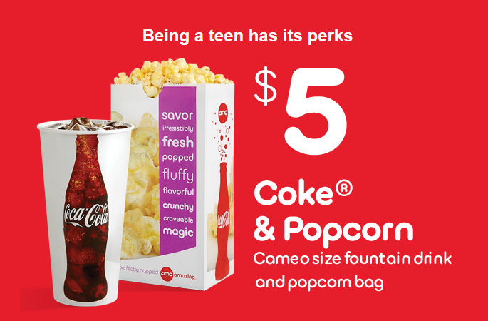 Here is a fun deal for teens! Teens can get a coupon for a Cameo sized fountain drink and a bag of popcorn for $5.