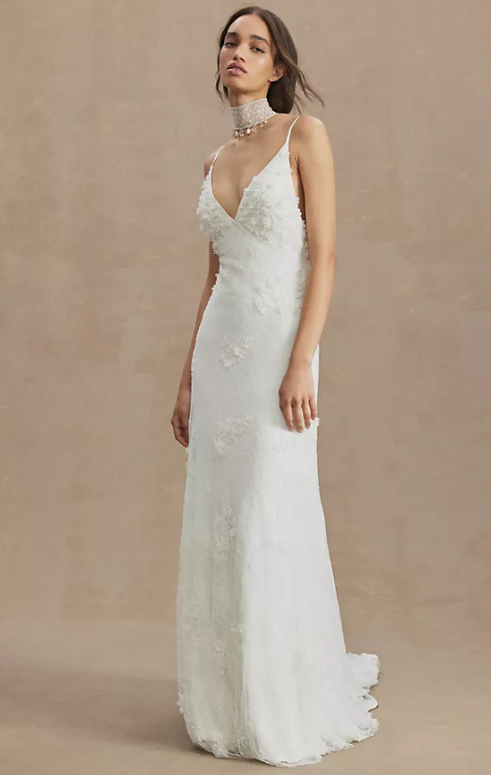 BHLDN Meadow V-Neck Floral Appliqué Sheath Wedding Gown – $500 (reg. $1,495)