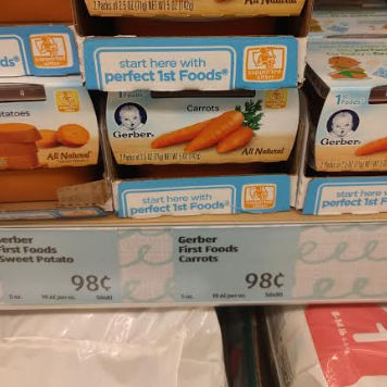 Gerber Products- While most of the baby section is Little Journey, they were offering select Gerber products at my store. This might vary by location, so you will need to check your store. Their baby food is an average price but they did have a decent deal on Gerber Cereals.