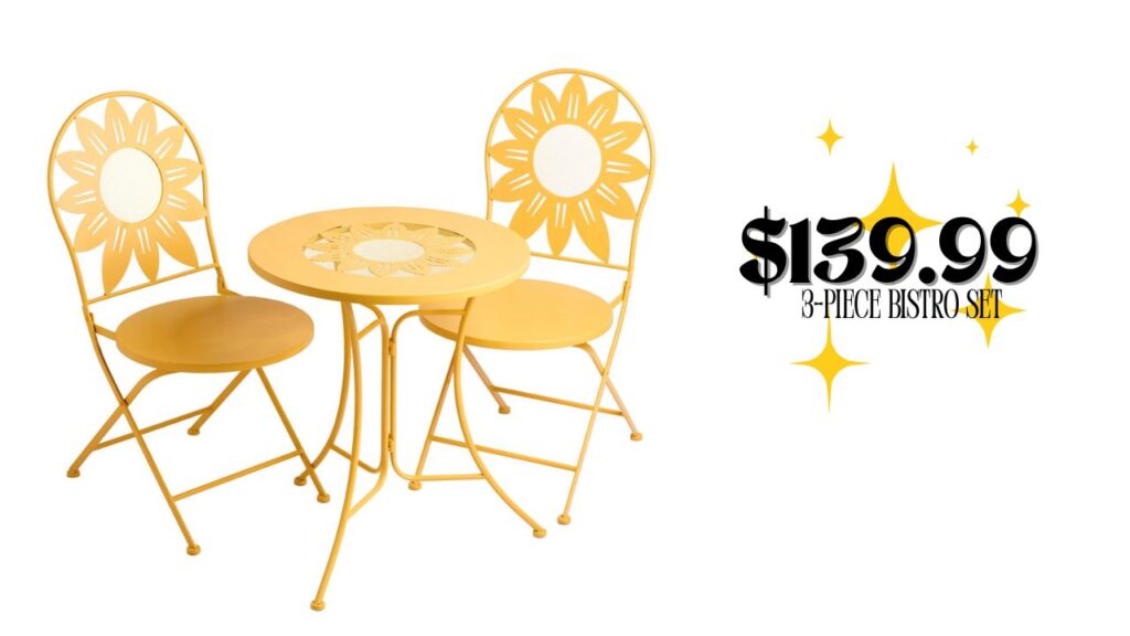 This bistro set is available in five colors. I’m partial to the sunflower color. It’s the perfect way to brighten my mornings as I enjoy my coffee outdoors. The chairs also fold up for easy storage!