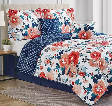 Includes 1 quilt, 2 shams, 1 bedskirt, 2 decorative pillows
