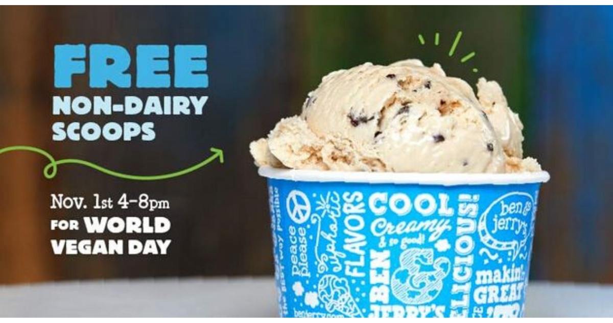 Ben & Jerry’s fans, mark your calendars for November 1st! From 4-8pm at participating Ben & Jerry’s Scoop Shops, get a FREE cup or cone of Non-Dairy ice cream! This is in honor of World Vegan Day.