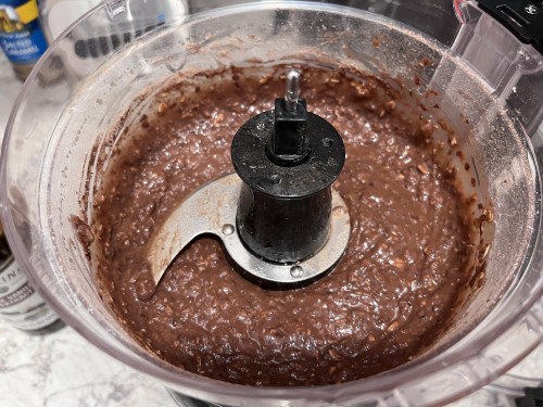 The other key part of this recipe is using a food processor. I used a 10-cup food processor and it easily fit all the ingredients. You’re going to add everything except the chocolate chips and get it as smooth as possible. The oats may make give it a little bit of texture, but that’s fine.
