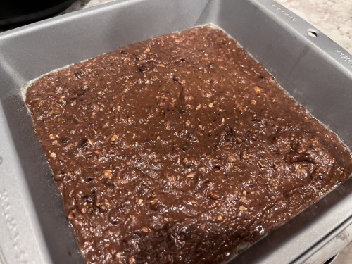 Mix in chocolate chips and spread in a greased 8×8 pan.