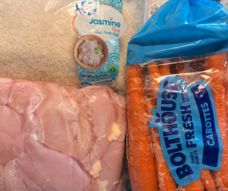 I started with about 4.5 pounds of chicken breasts (butterflied), 3 cups jasmine rice, and 5 lb of carrots.