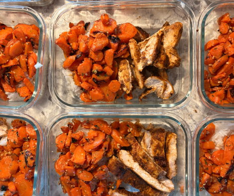 Then it was time to assemble the meals! I used 10 glass containers and to each one added about 6 ounces sliced chicken, 1/2 cup of rice, and 1/2 cup of carrots. (You could change this up depending on your nutritional goals).