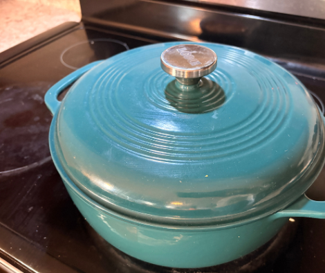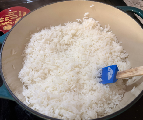 I also got some water boiling and added 3 cups of jasmine rice and let it set. (I got this Dutch oven for Christmas–I love it!)