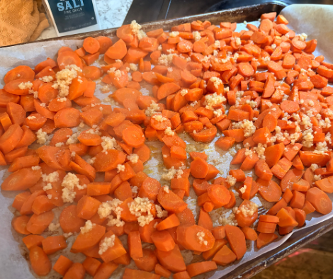 After the carrots had been cooking for a bit, I added some minced garlic and set them back in the oven.
